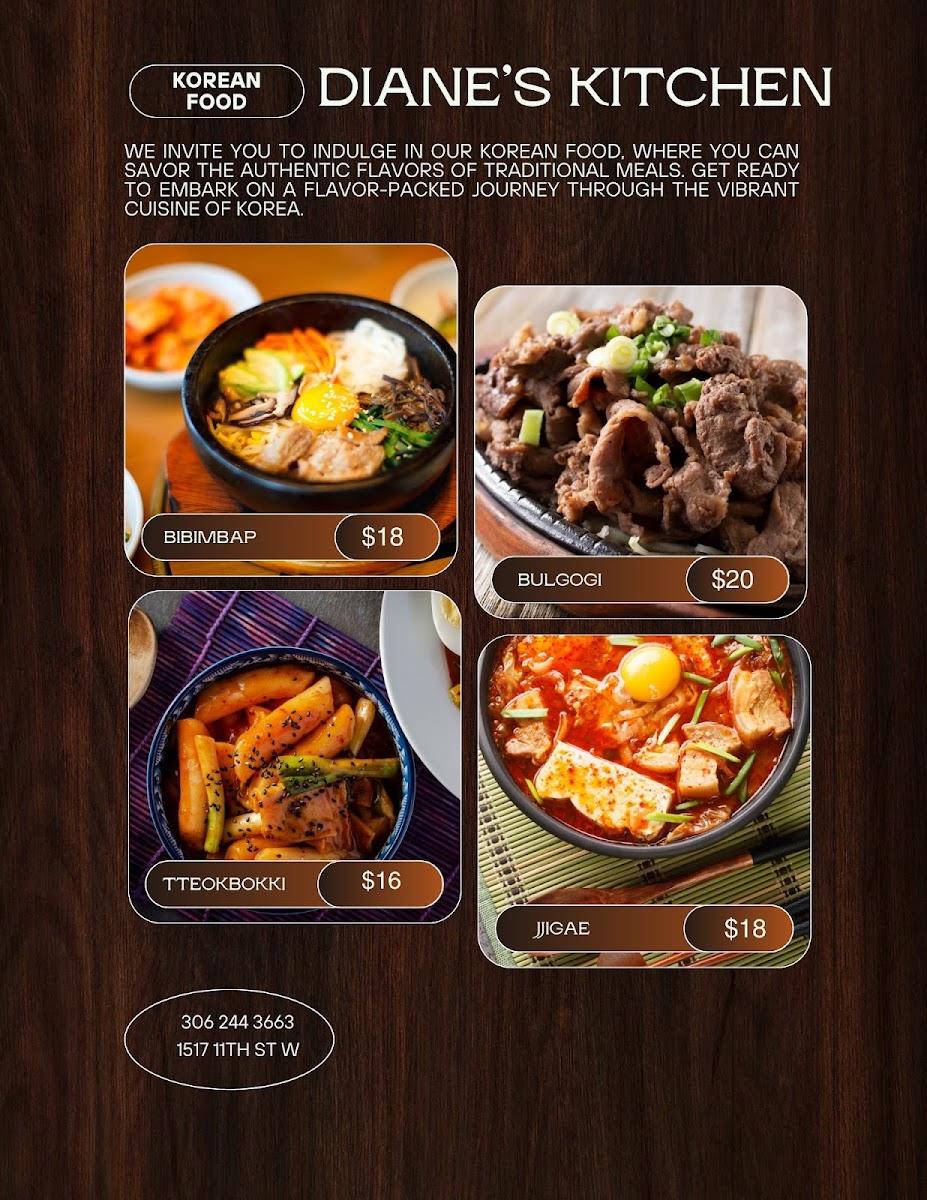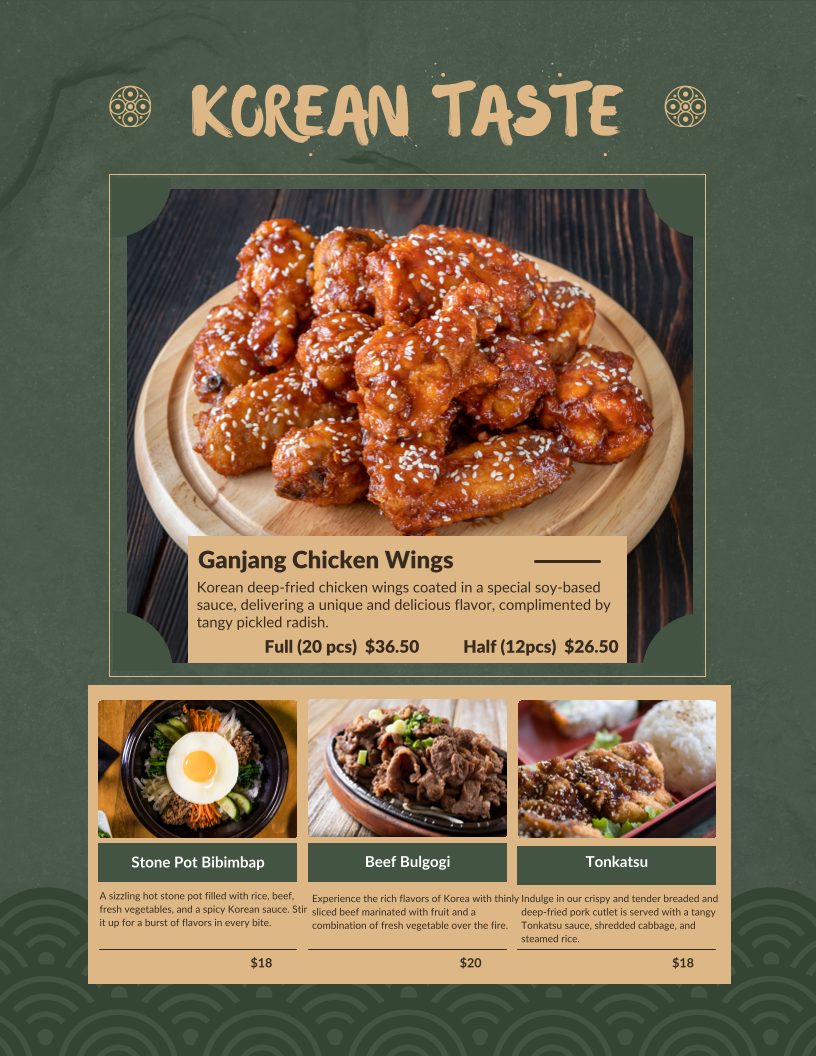 This menu suits casual dining occasions or takeout orders, offering substantial portions suitable for lunch or dinner. The range of dishes allows for exploring Korean cuisine through various cooking methods and ingredient combinations.