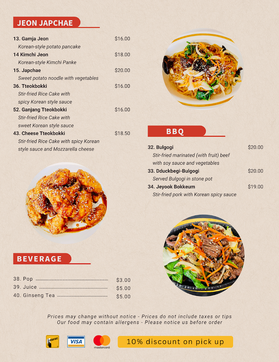 Appetizers and Side Dishes: Options like Seafood Pancake, Japchae (stir-fried glass noodles with vegetables), and Ganjang Tteokbokki (soy sauce-flavored rice cakes) complement the main selections with traditional tastes and textures.